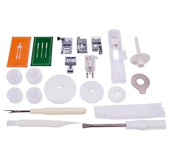 Машина оснащена горизонтальным челночным устройством с прозрачной шпулей и прозрачной крышкой, через которую очень удобно контролировать остаток нити на шпуле. Кроме того такое челночное устройство не требует смазки и в него очень удобно заправлять шпулю.