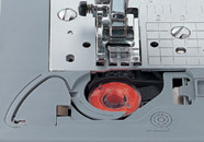 Машина оснащена горизонтальным челночным устройством с прозрачной шпулей и прозрачной крышкой, через которую очень удобно контролировать остаток нити на шпуле. Кроме того такое челночное устройство не требует смазки и в него очень удобно заправлять шпулю.