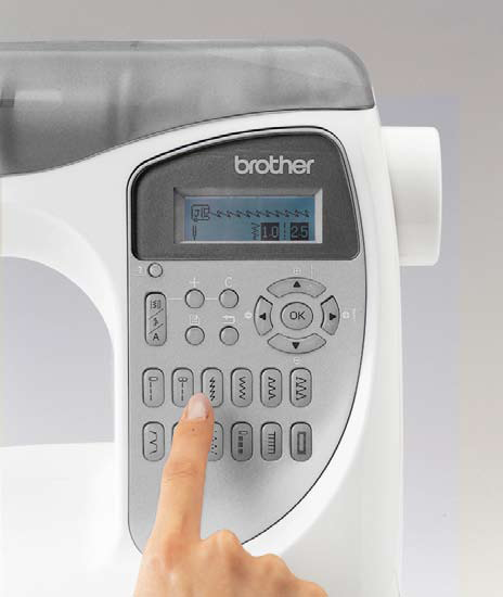 На жидкокристаллическом дисплее отображается выбранная строчка, а также установки для нее: длина стежка и ширина строчки, а так же необходимая лапка. Если потребуется, ширину и длину стежка можно быстро изменить. Если Вы часто используете не стандартное значение параметров стежка, Вы можете сохранить в памяти удобные для Вас параметры.