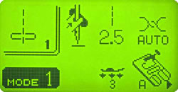 Информативный дисплей швейной машины Janome Memory Craft 5200 графически отображает выбранную строчку и её параметры — ширину, длину, а также необходимую лапку и рекомендуемые параметры давления лапки на ткань и натяжения