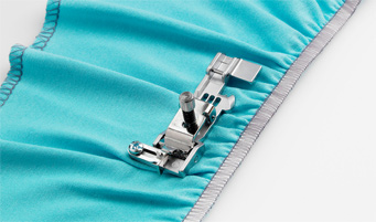 Используется для всех сильнорастяжимых швов, которые требуется укрепить, такие как горловина, боковые швы, рукава и т. д. Также этот шов используется для сборок, вшивания канта и резинки с дополнителными лапками.