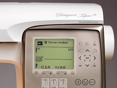 Воспользуйтесь любым из 163 швов или 5 алфавитами в модели DESIGNER TOPAZ™ 30. Можно выбрать нужную строчку визуально или по ее номеру на сенсорной панели машины! При этом на дисплее DESIGNER TOPAZ™ GraphicDisplay отобразится ее размер и рекомендуемые параметры.