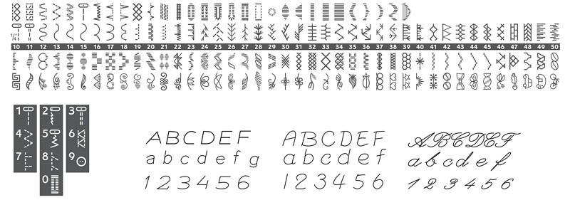 Воспользуйтесь любым из 163 швов или 5 алфавитами в модели DESIGNER TOPAZ™ 30. Можно выбрать нужную строчку визуально или по ее номеру на сенсорной панели машины! При этом на дисплее DESIGNER TOPAZ™ GraphicDisplay отобразится ее размер и рекомендуемые параметры.